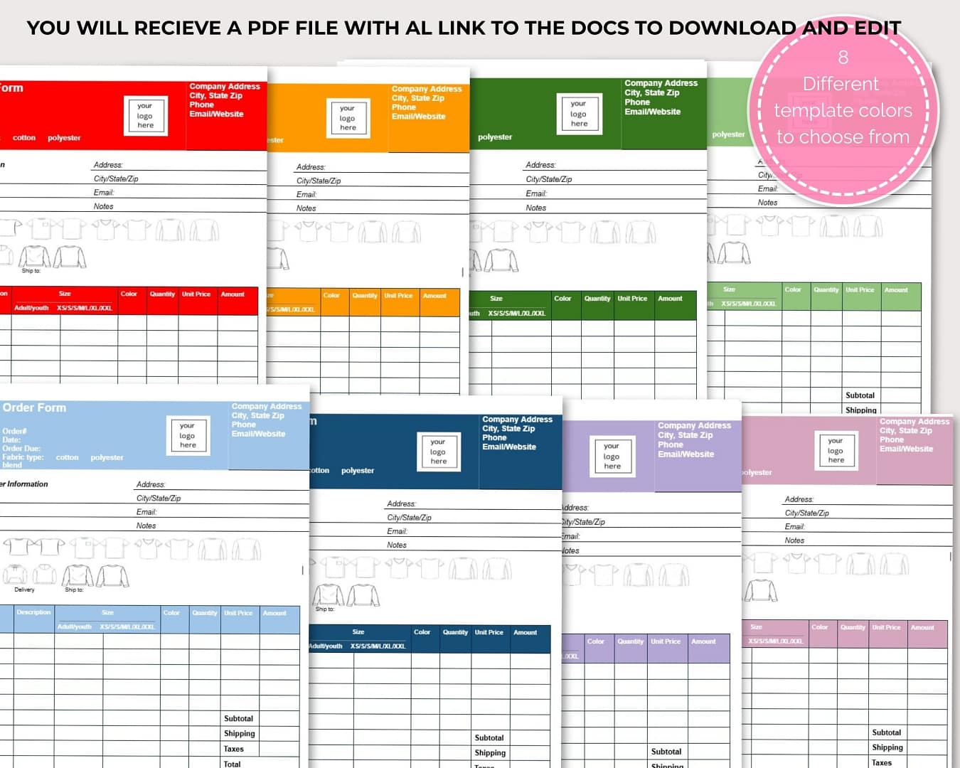 Editable Google Docs t-shirt order form in 8 different colors