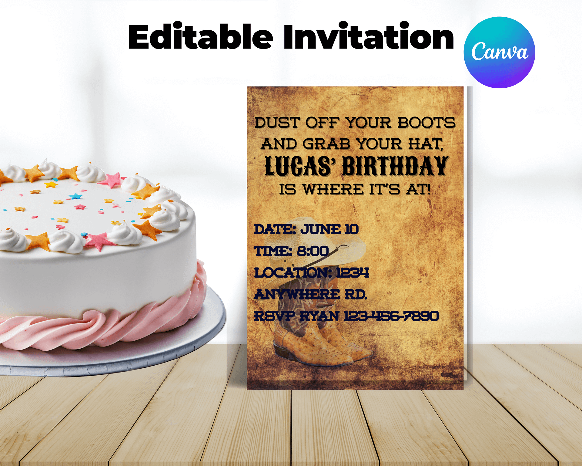 Editable birthday party invitation and editable digital birthday party invitation. Both are editable in Canva