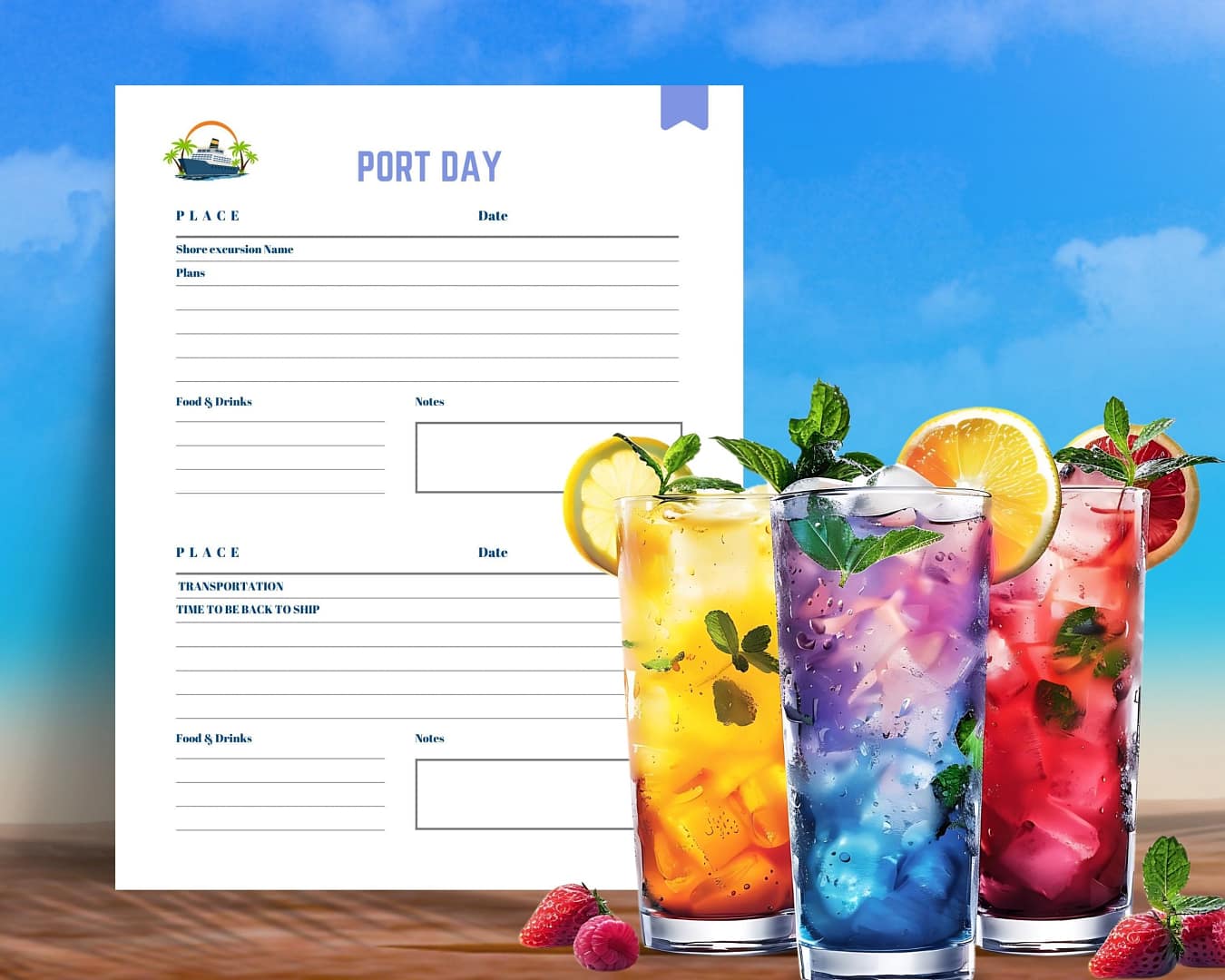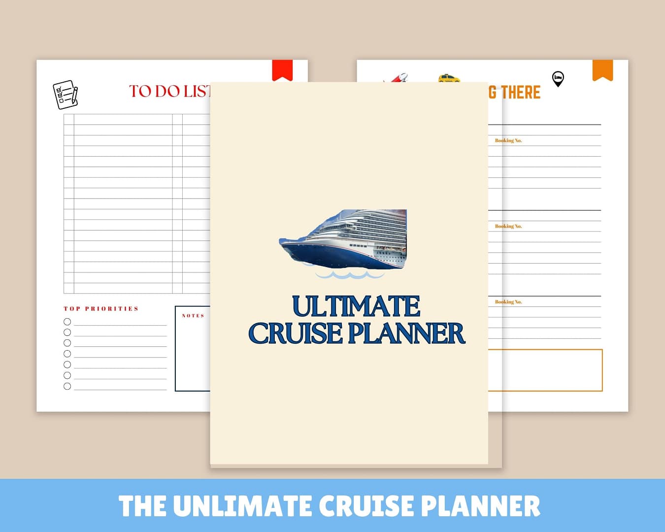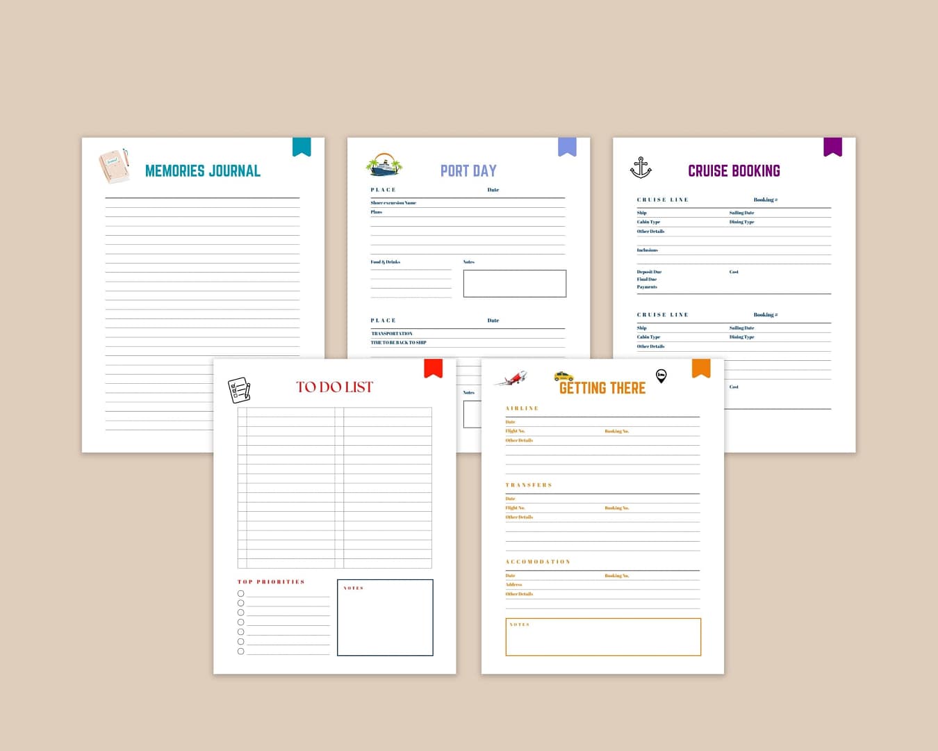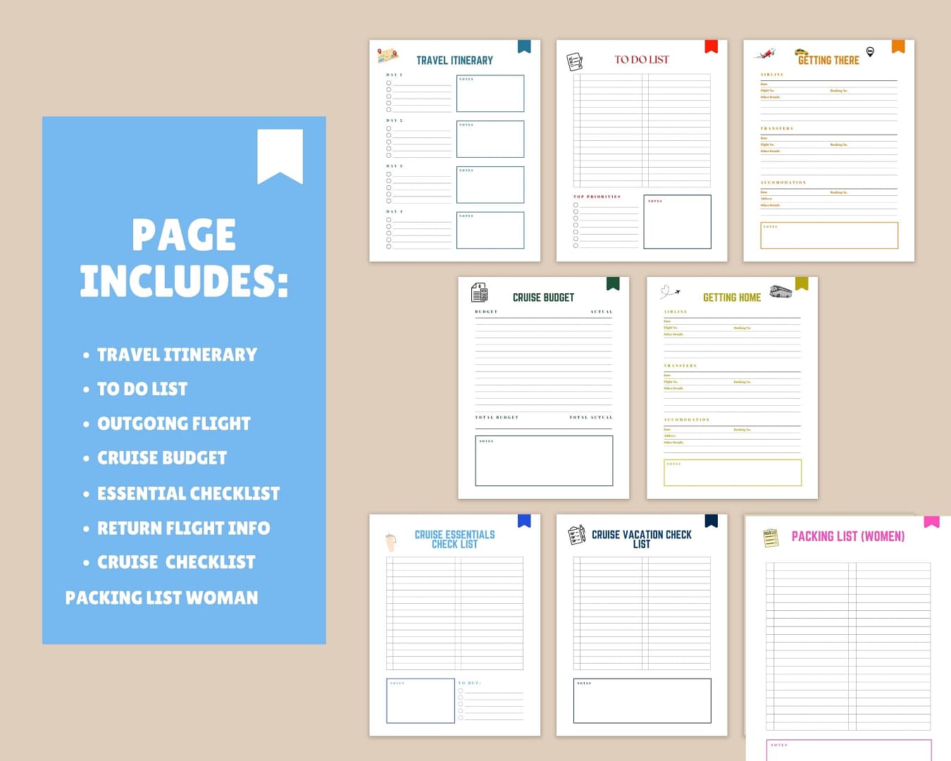 Printable Cruise Planner Itinerary, to-do list, getting there, getting home, cruise budget, cruise vacation checklist, cruise essentials checklist, medical list, packing list-men, women, and kids, outfit planner, payment tracker, loyalty program info, website password tracker, emergency contacts, cruise booking, port day, memories journal